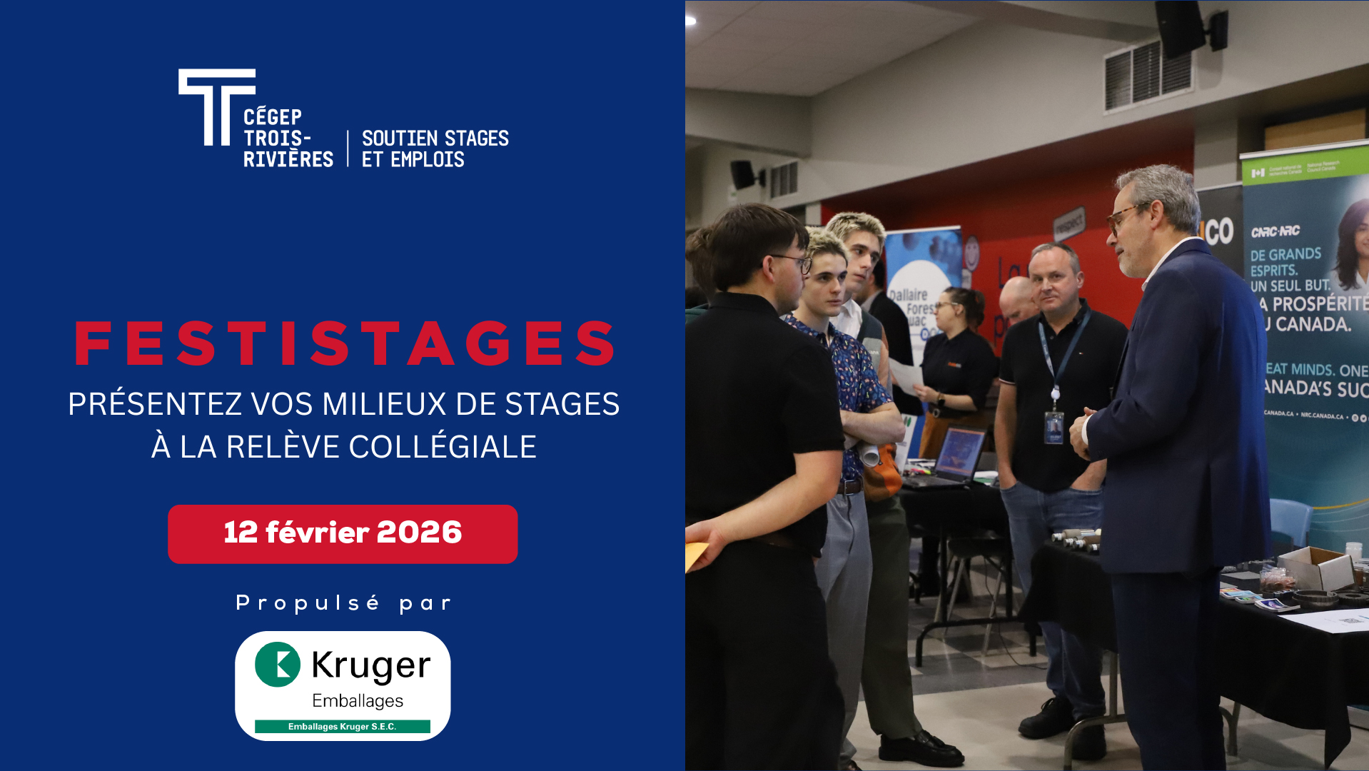 L’équipe du Soutien stages et emplois du Cégep de Trois-Rivières vous invite à sa 3e édition du FestiStages le 12 février prochain, rassemblant les entreprises et la communauté étudiante qualifiée et motivée à travailler.